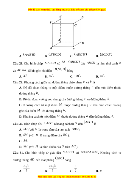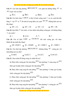 Câu 21. Cho hình lập phương . Đường thẳng vuông góc với mặt phẳng nào sau đây? A. . B. . C. . D. .