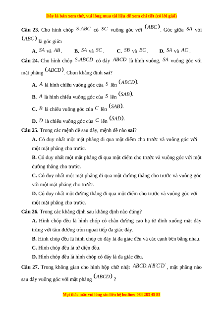 Câu 23. Cho hình chóp có vuông góc với . Góc giữa với là góc giữa A. và . B. và . C. và . D. và .