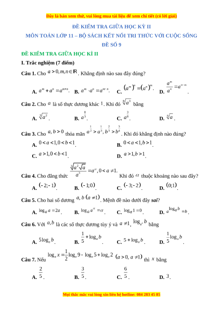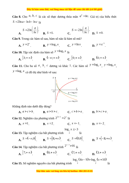 là các số thực dương tùy ý và , bằng A. . B. . C. . D. . Câu 7. Nếu thì bằng A. . B. . C. . D. .