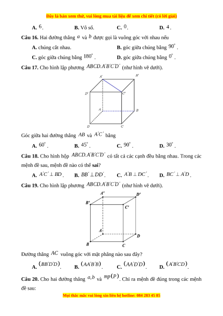 Câu 17. Cho hình lập phương (như hình vẽ dưới).
