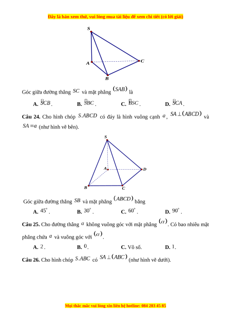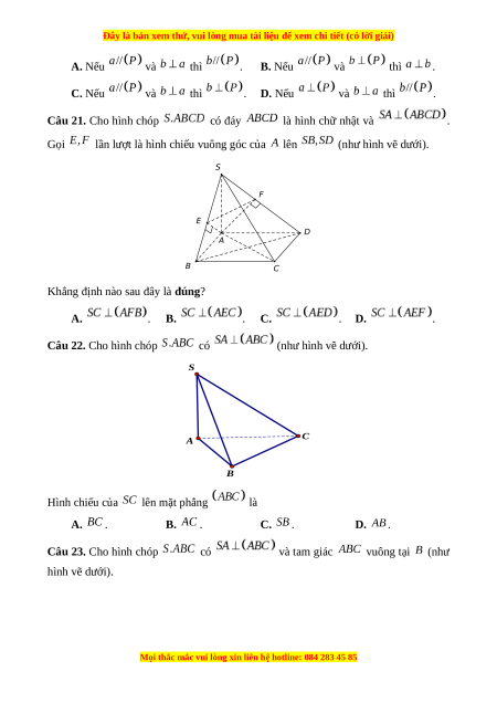 Câu 22. Cho hình chóp có (như hình vẽ dưới). S A C B Hình chiếu của lên mặt phẳng là A. . B. . C. . D. .