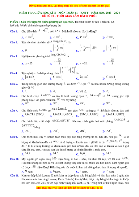 Đề thi giữa kì 2 Toán 11 Kết nối tri thức (theo cấu trúc đề minh họa 2025) Đề 10