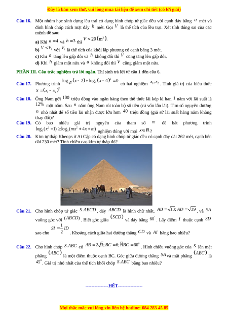 Câu 20. Kim tự tháp Kheops ở Ai Cập có dạng hình chóp tứ giác đều có cạnh đáy dài 262 mét, cạnh bên