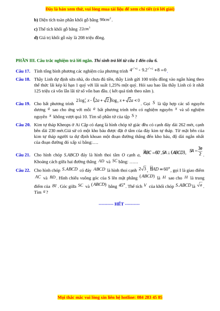 Câu 20. Kim tự tháp Kheops ở Ai Cập có dạng là hình chóp tứ giác đều có cạnh đáy dài 262 mét, cạnh