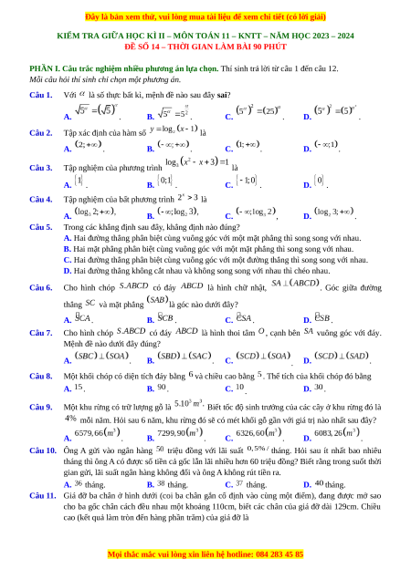Đề thi giữa kì 2 Toán 11 Kết nối tri thức (theo cấu trúc đề minh họa 2025) Đề 14