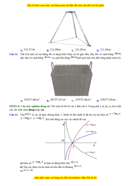 Câu 12. Thể tích một cái sọt đựng đồ có dạng hình chóp cụt tứ giác đều, đáy lớn có cạnh bằng , đáy nhỏ có cạnh bằng và cạnh bên bằng