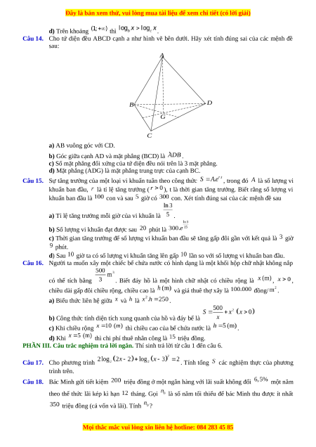 Câu 15. Sự tăng trưởng của một loại vi khuẩn tuân theo công thức