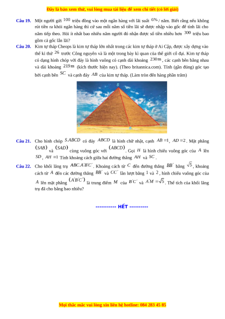 Câu 20. Kim tự tháp Cheops là kim tự tháp lớn nhất trong các kim tự tháp ở Ai Cập, được xây dựng vào thế kỉ thứ