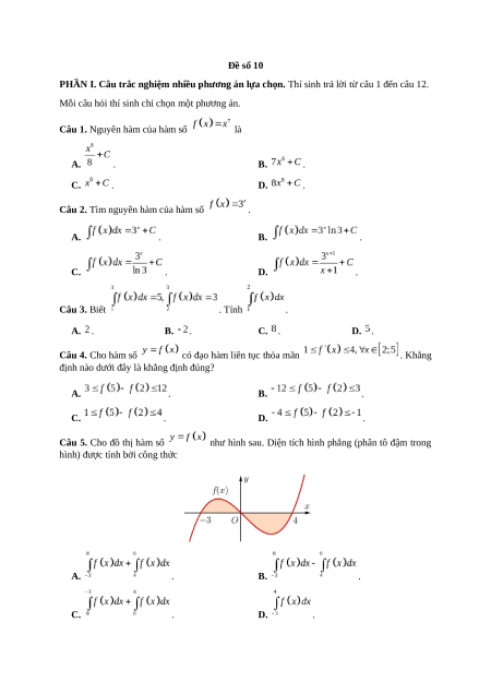 Câu 2. Tìm nguyên hàm của hàm số . A. . B. . C. . D. . Câu 3. Biết . Tính . A. . B. . C. . D. . Câu 4. Cho hàm số