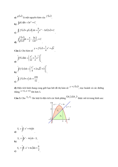 c), d) ở mỗi câu, thí sinh chọn đúng hoặc sai. Câu 1. Cho hàm số và . a) là một nguyên hàm của . b) . c) . d) . Câu 2. Cho hàm số . a) . b) . c) .