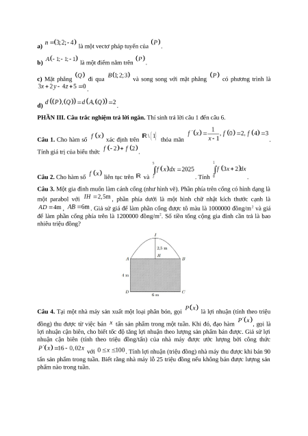 PHẦN III. Câu trắc nghiệm trả lời ngắn. Thí sinh trả lời câu 1 đến câu 6. Câu 1. Cho hàm số xác định trên thỏa mãn .