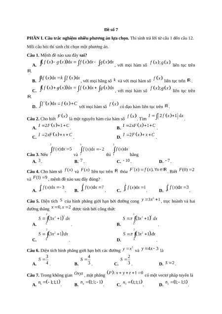 Câu 1. Mệnh đề nào sau đây sai? A. , với mọi hàm số liên tục trên B.