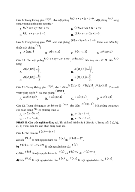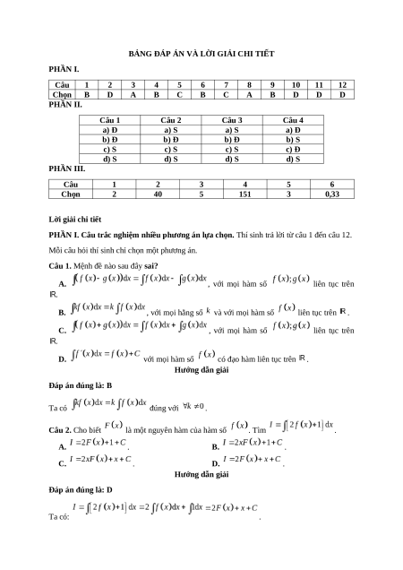c), d) ở mỗi câu, thí sinh chọn đúng hoặc sai. Câu 1. Cho hàm số . a) Nếu là một nguyên hàm của thì . b) là một nguyên hàm của . c) Nếu là một nguyên hàm của và thì . d) Nếu là một nguyên hàm của thì là một nguyên hàm của .