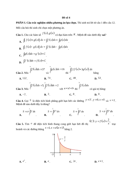 hoành và các đường thẳng bằng 2. A. . B. . C. . D. . Câu 6. Cho hàm số . Tính tích phân . A. . B. . C. . D. .