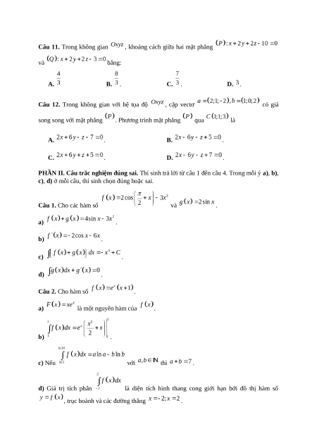 Câu 1. Cho các hàm số và . a) . b) . c) . d) . Câu 2. Cho hàm số . a) là một nguyên hàm của . b) . c) Nếu với thì .