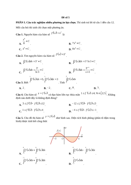 Câu 2. Tìm nguyên hàm của hàm số . A. . B. . C. . D. . Câu 3. Biết . Tính . A. . B. . C. . D. . Câu 4. Cho hàm số
