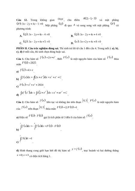 là một nguyên hàm của hàm số thỏa mãn . a) . b) . c) . d) . Câu 2. Cho hàm số
