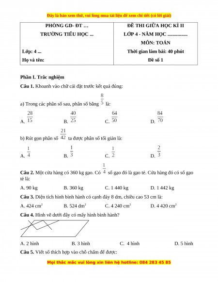 Đề thi giữa kì 2 Toán 4 năm 2023 (Đề 1)