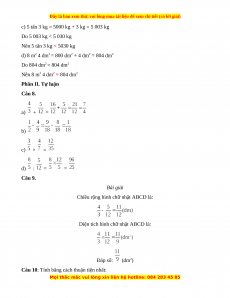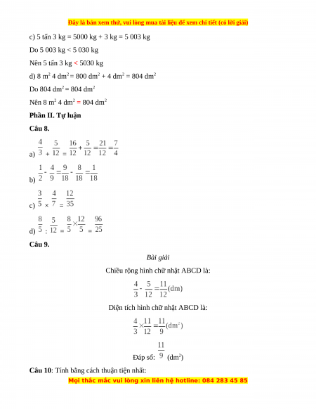 b) 5 tấn 3 kg ........ 5030kg d) 8m2 4dm2 ......... 804dm2 = Phần II. Tự luận Câu 8. Tính: a) + b) - c) × d) :