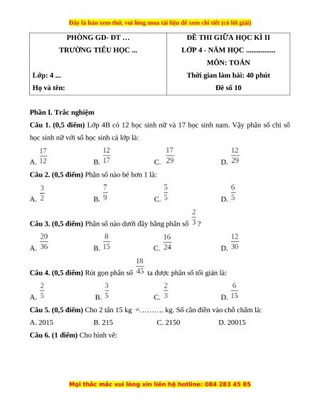 Câu 1. (0,5 điểm) Lớp 4B có 12 học sinh nữ và 17 học sinh nam. Vậy phân số chỉ số