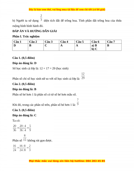 Khi đó, trong các phân số trên, phân số bé hơn 1 là: Câu 3. (0,5 điểm) Đáp án đúng là: C Ta có: Phân số không rút gọn được.