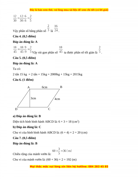 Chu vi của hình bình hành ABCD là: (6 + 4) × 2 = 20 (cm) Câu 7. (0,5 điểm) Đáp án đúng là: B