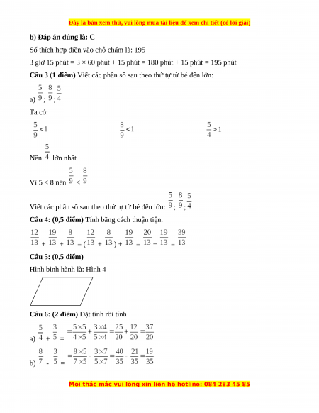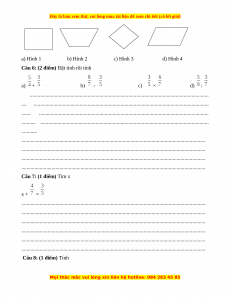 Câu 4: (0,5 điểm) Tính bằng cách thuận tiện. + + = ( + ) + = + = Câu 5: (0,5 điểm) Hình bình hành là: Hình 4