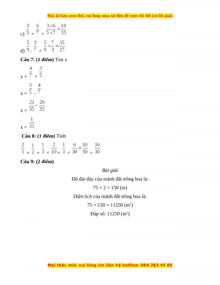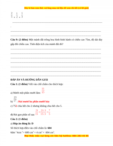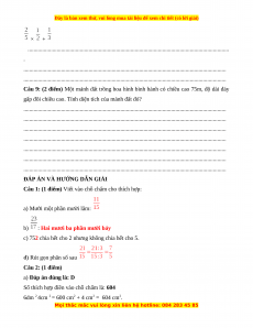 Câu 9: (2 điểm) Một mảnh đất trồng hoa hình bình hành có chiều cao 75m, độ dài đáy