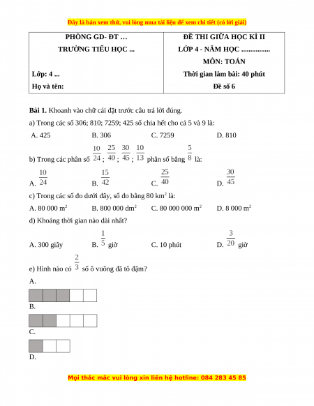 Đề thi giữa kì 2 Toán 4 năm 2023 (Đề 6)