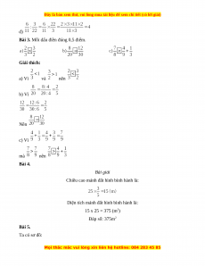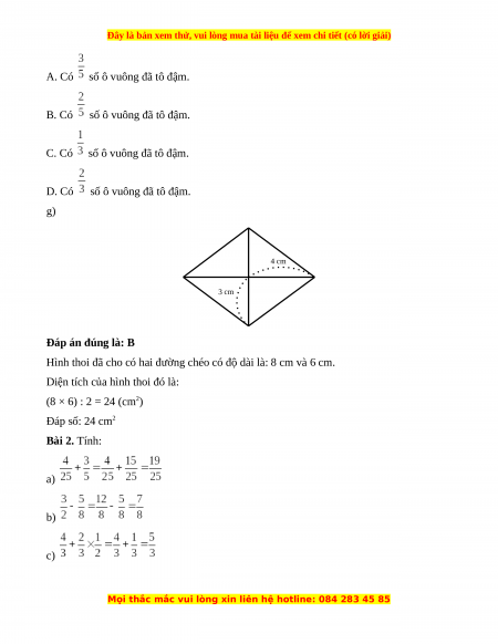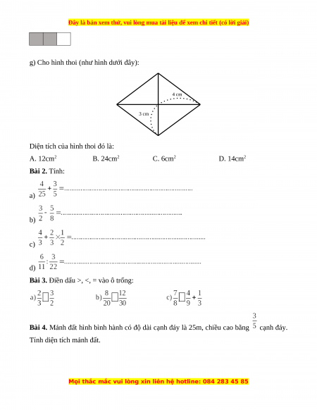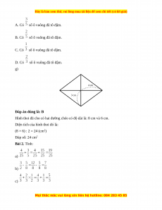Diện tích của hình thoi đó là: A. 12cm2 B. 24cm2 C. 6cm2 D. 14cm2 Bài 2. Tính: a) b) c) d)