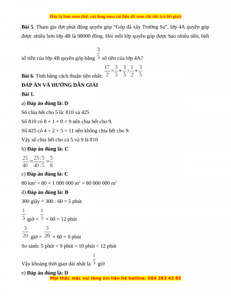 a) Trong các số 306; 810; 7259; 425 số chia hết cho cả 5 và 9 là: A. 425 B. 306 C. 7259 D. 810 b) Trong các phân số ; ; ; phân số bằng là: A. B. C. D.
