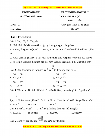 Đề thi giữa kì 2 Toán 4 năm 2023 (Đề 7)