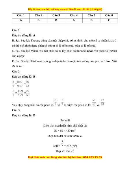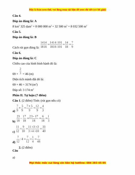 8 km2 325 dam2 = 8 000 000 m2 + 32 500 m2 = 8 032 500 m2 Câu 5. Đáp án đúng là: B Cách rút gọn đúng là: Câu 6. Đáp án đúng là: C