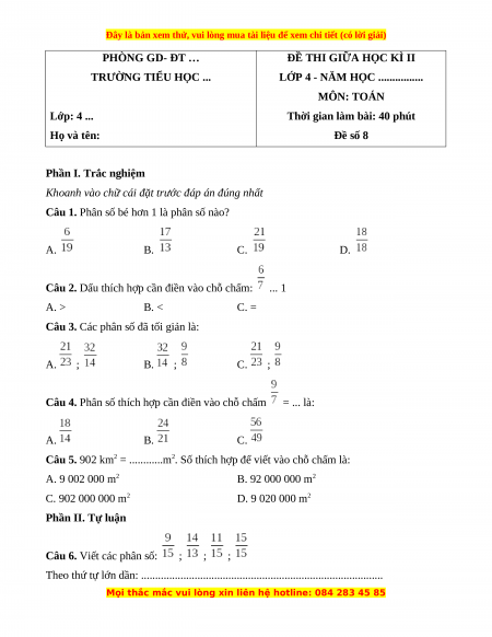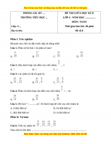 Đề thi giữa kì 2 Toán 4 năm 2023 (Đề 8)