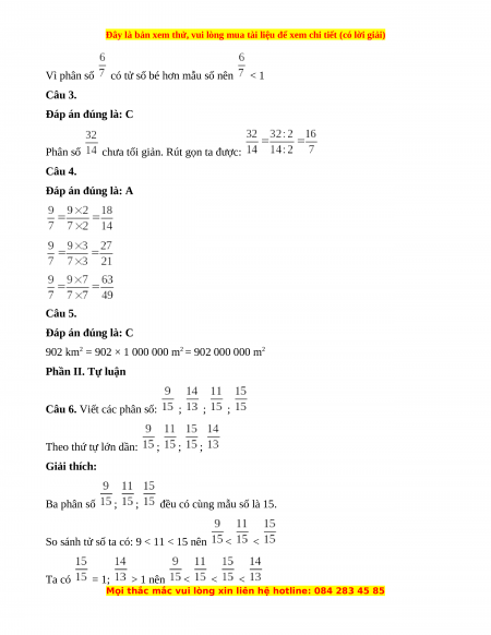 Vì phân số có tử số bé hơn mẫu số nên < 1 Câu 3. Đáp án đúng là: C Phân số