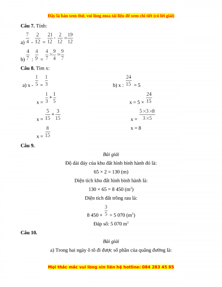 Câu 7. Tính: a) - = b) : = Câu 8. Tìm x: a) x - = b) x : = 5 x = x = 5 × x = x = x = 8 x = Câu 9. Bài giải
