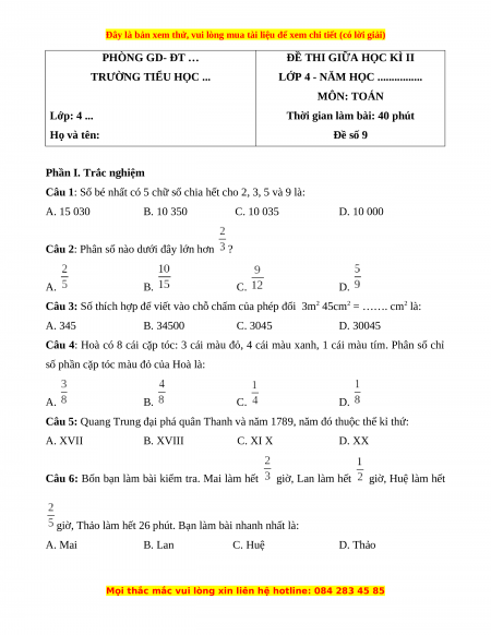 Đề thi giữa kì 2 Toán 4 năm 2023 (Đề 9)