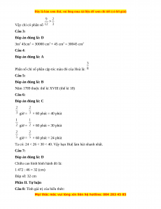 Ta có: 24 < 26 < 30 < 40. Vậy bạn Huệ làm bài nhanh nhất. Câu 7: Đáp án đúng là: D