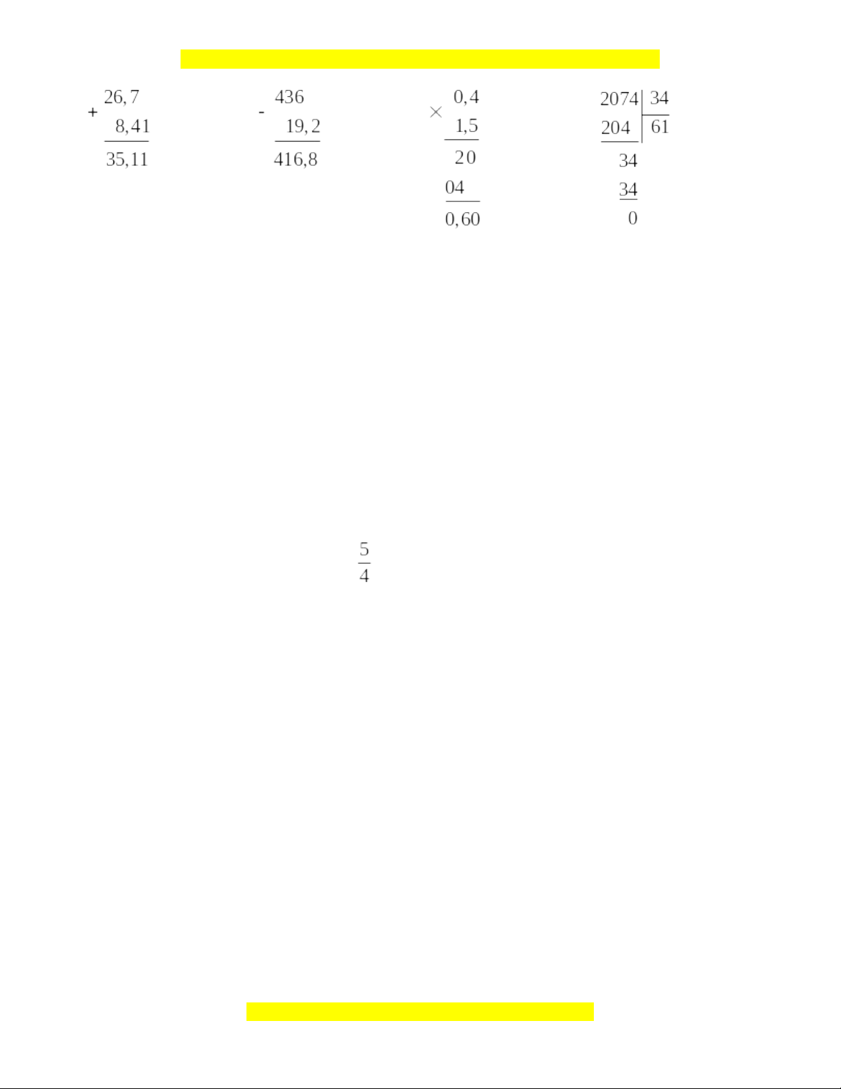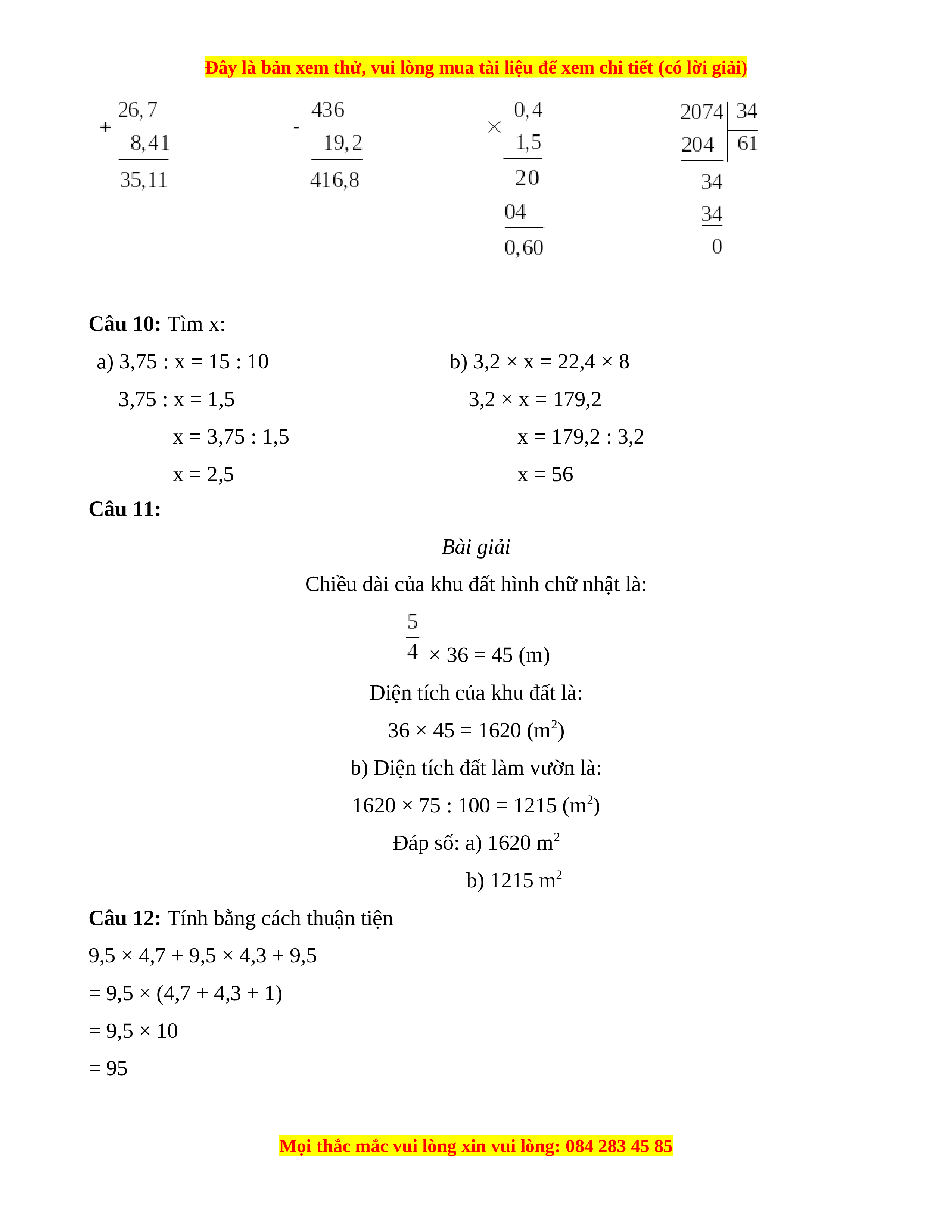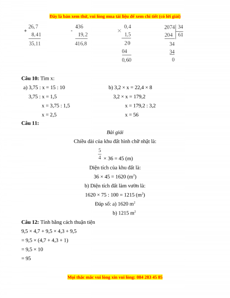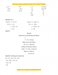 Câu 9: Đặt tính rồi tính a) 26,7 + 8,41 b) 436 - 19,2 c) 0,4 × 1,5 d) 2074 : 34 Câu 10: Tìm x: a) 3,75 : x = 15 : 10 b) 3,2 × x = 22,4 × 8