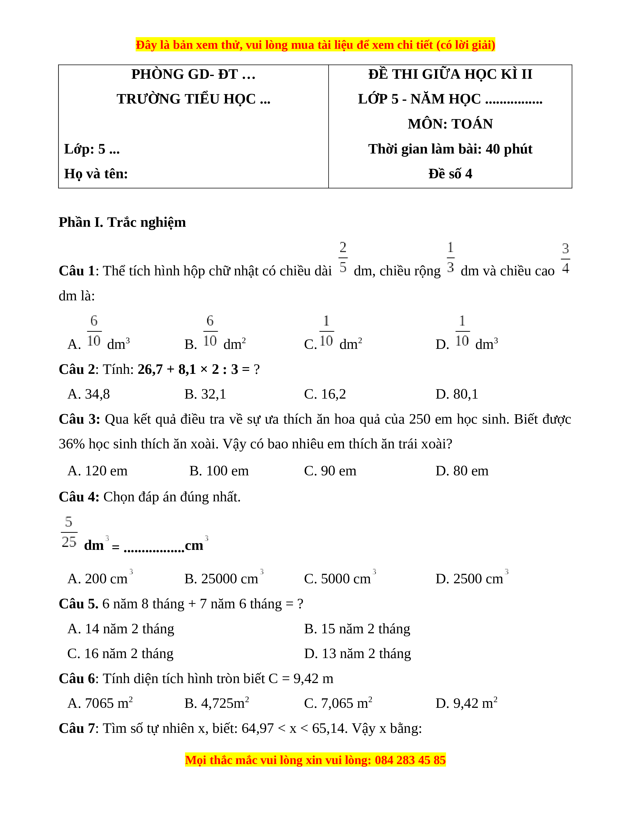 Đề thi giữa kì 2 Toán 5 năm 2023 (Đề 4)