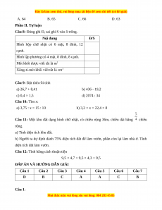 Câu 1: Thể tích hình hộp chữ nhật có chiều dài dm, chiều rộng dm và chiều cao dm là: A. dm3 B. dm2 C. dm2 D. dm3
