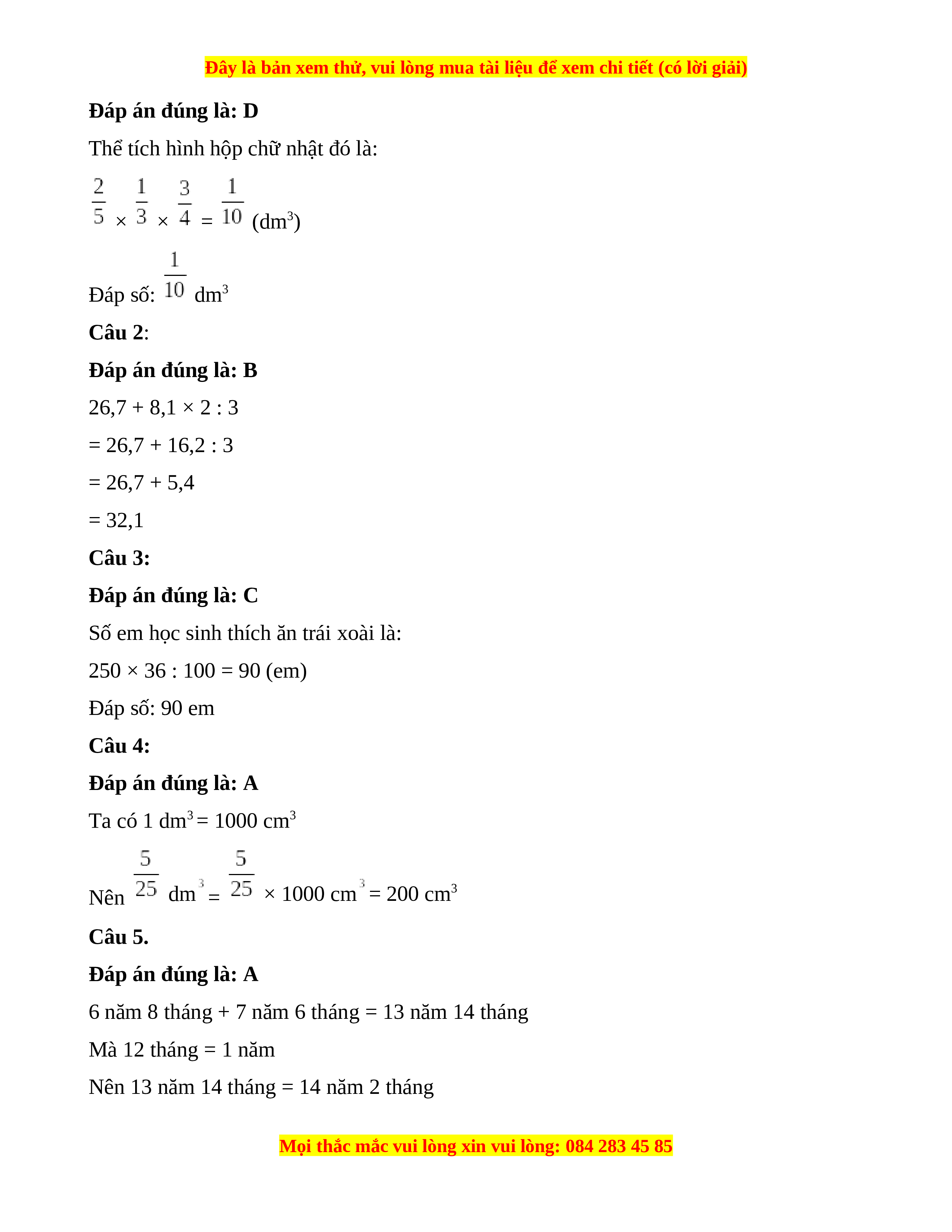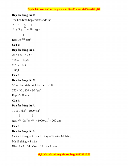 Số em học sinh thích ăn trái xoài là: 250 × 36 : 100 = 90 (em) Đáp số: 90 em Câu 4: Đáp án đúng là: A Ta có 1 dm3 = 1000 cm3 Nên dm = × 1000 cm = 200 cm3 Câu 5. Đáp án đúng là: A