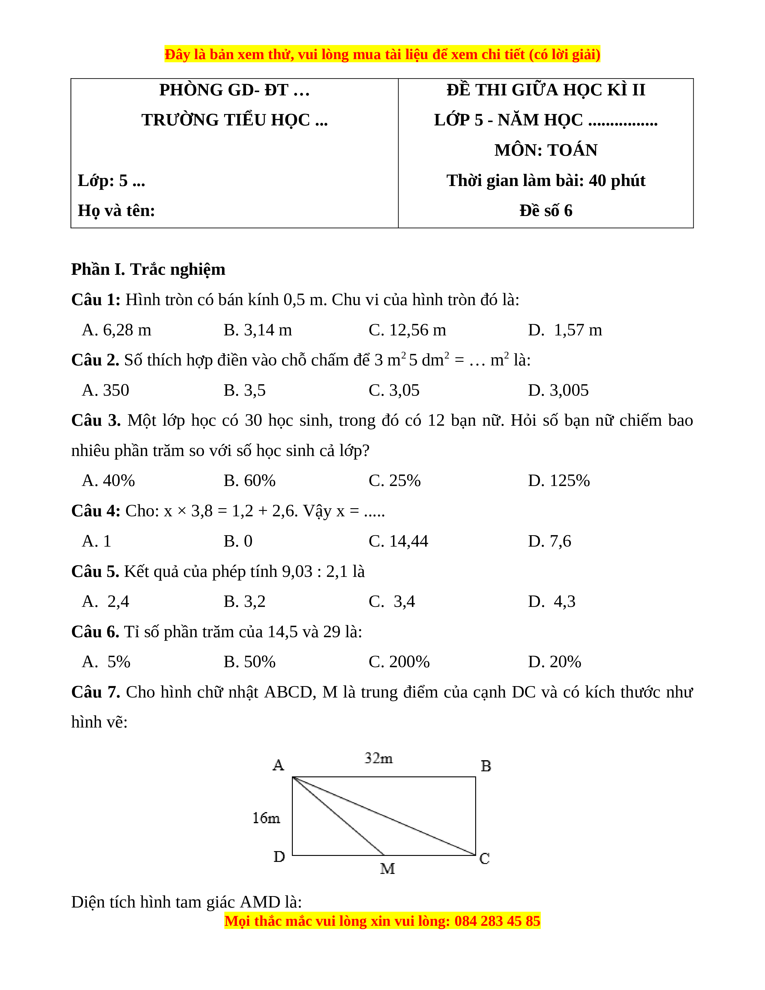 Đề thi giữa kì 2 Toán 5 năm 2023 (Đề 6)