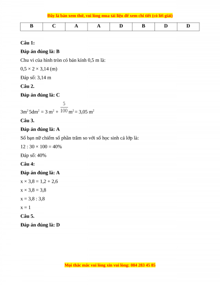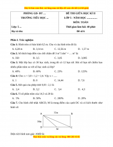 Chu vi của hình tròn có bán kính 0,5 m là: 0,5 × 2 × 3,14 (m) Đáp số: 3,14 m Câu 2. Đáp án đúng là: C 3m2 5dm2 = 3 m2 + m2 = 3,05 m2 Câu 3. Đáp án đúng là: A