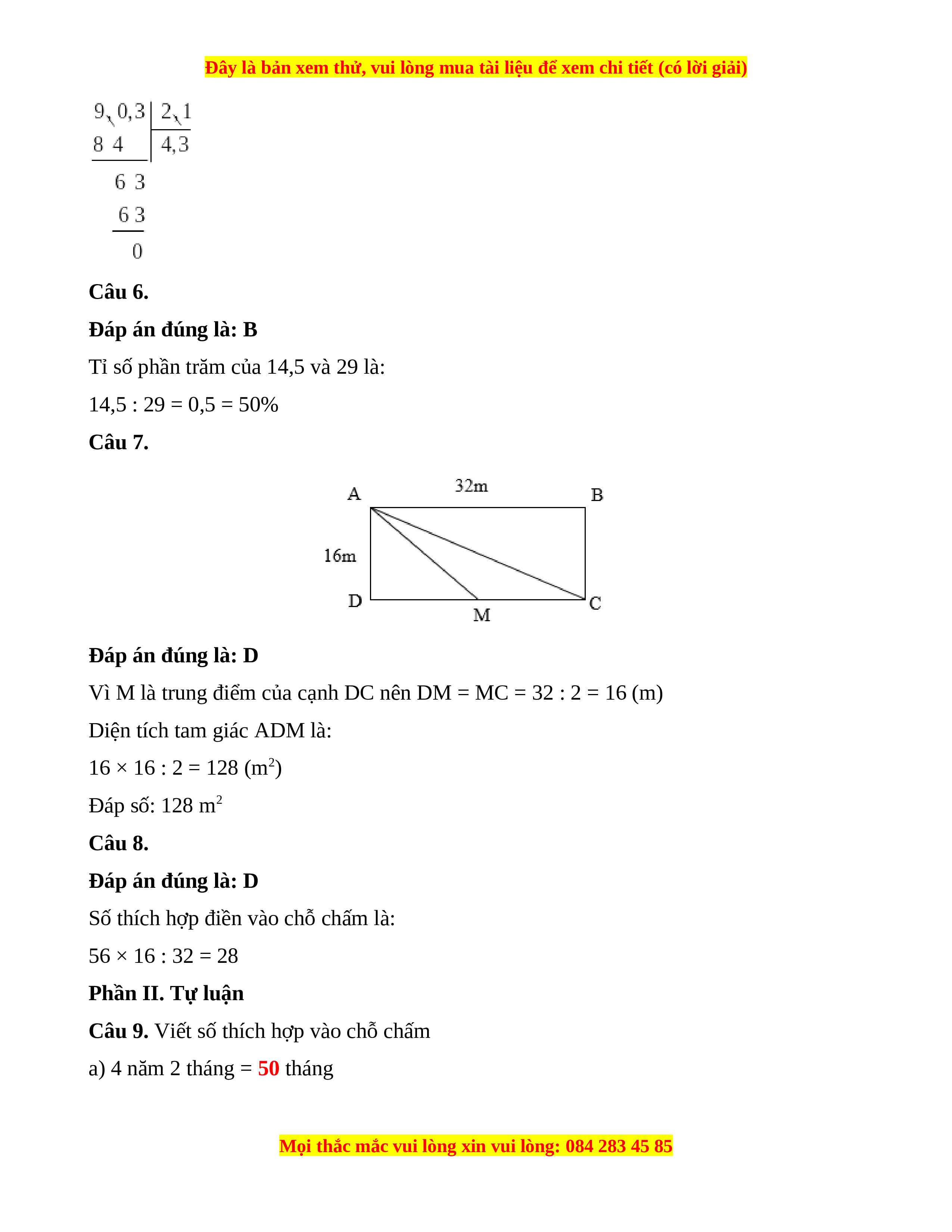 Tỉ số phần trăm của 14,5 và 29 là: 14,5 : 29 = 0,5 = 50% Câu 7. Đáp án đúng là: D