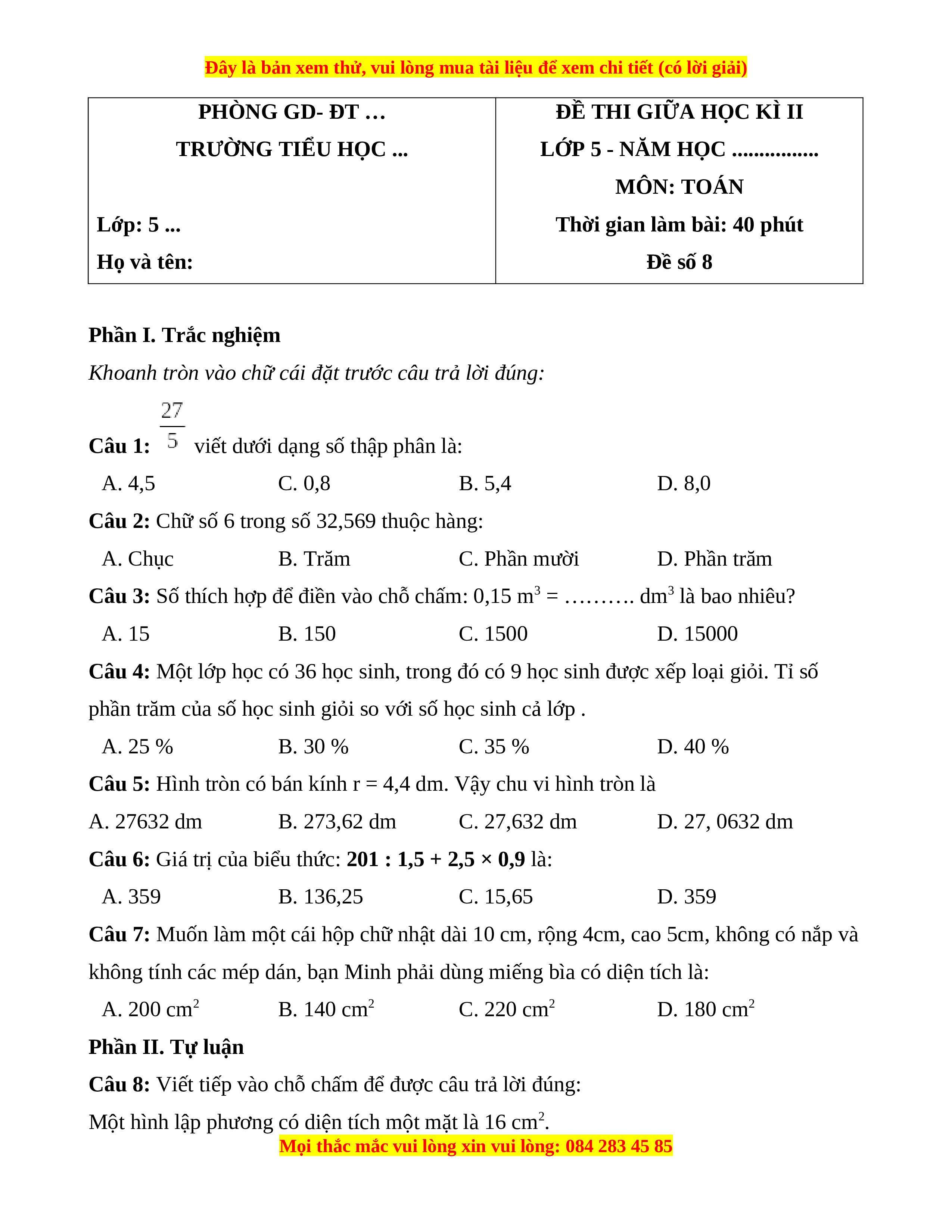Đề thi giữa kì 2 Toán 5 năm 2023 (Đề 8)