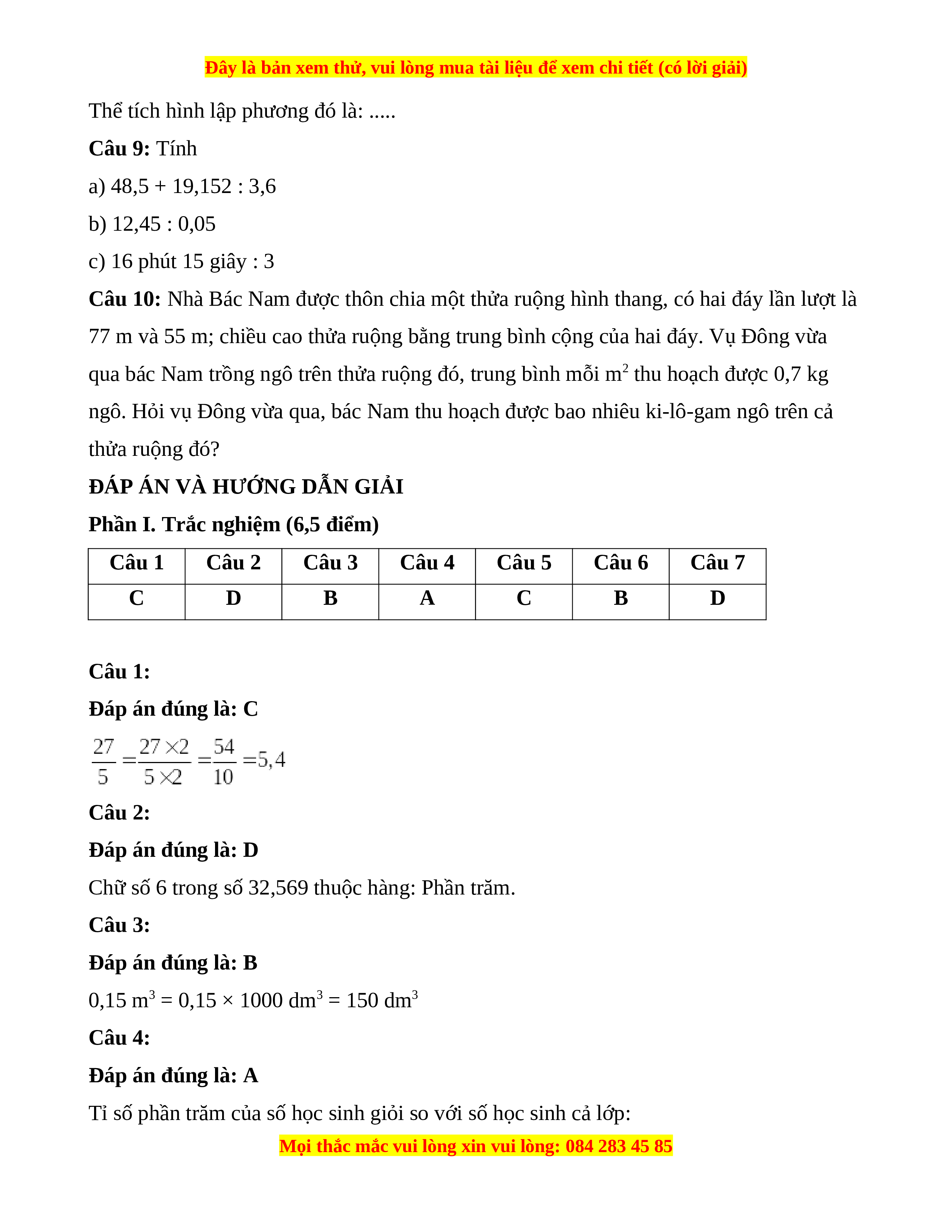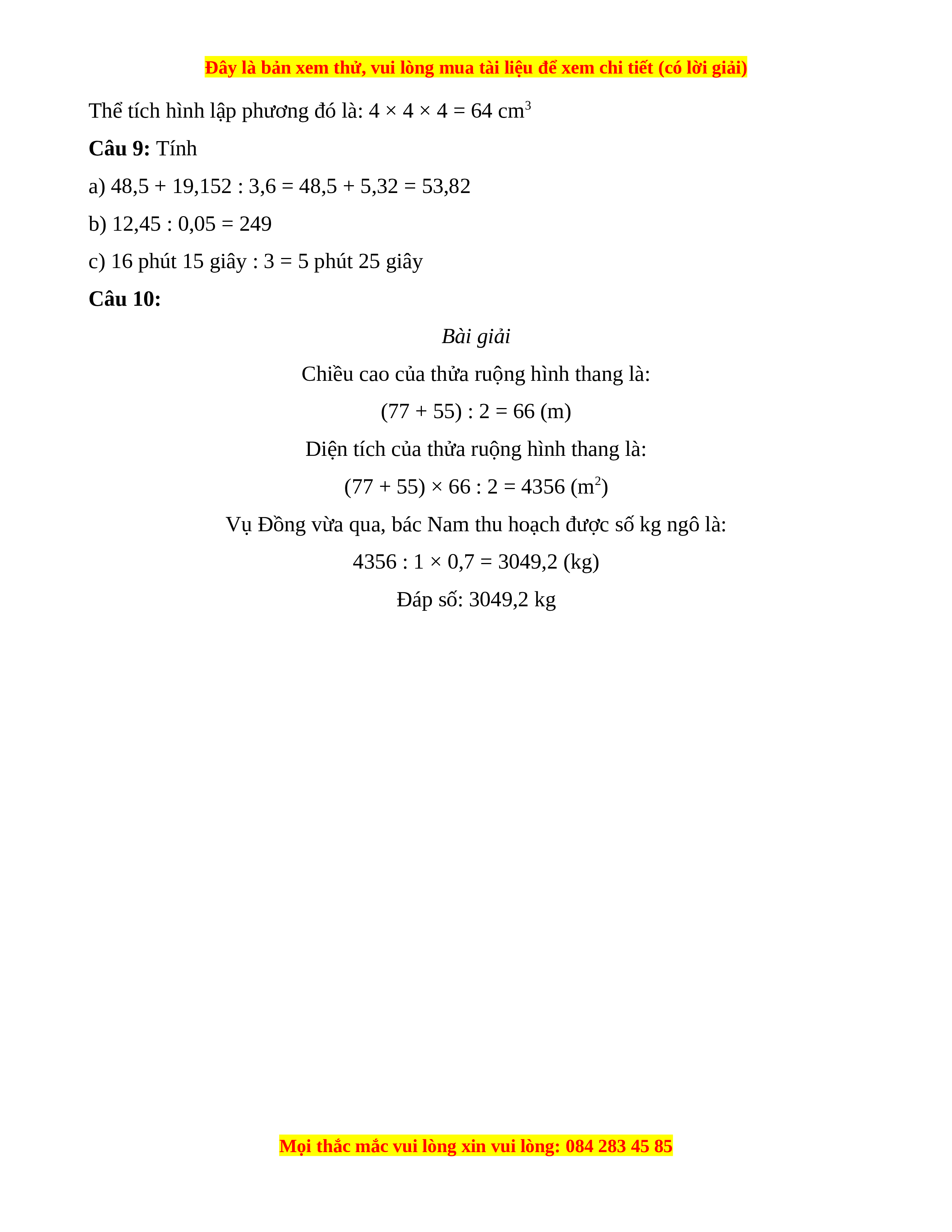 Thể tích hình lập phương đó là: ..... Câu 9: Tính a) 48,5 + 19,152 : 3,6 b) 12,45 : 0,05 c) 16 phút 15 giây : 3