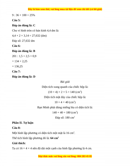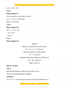 Bạn Minh phải dùng miếng bìa có diện tích là: 140 + 40 = 180 (cm2) Đáp số: 180 cm2 Phần II. Tự luận Câu 8:
