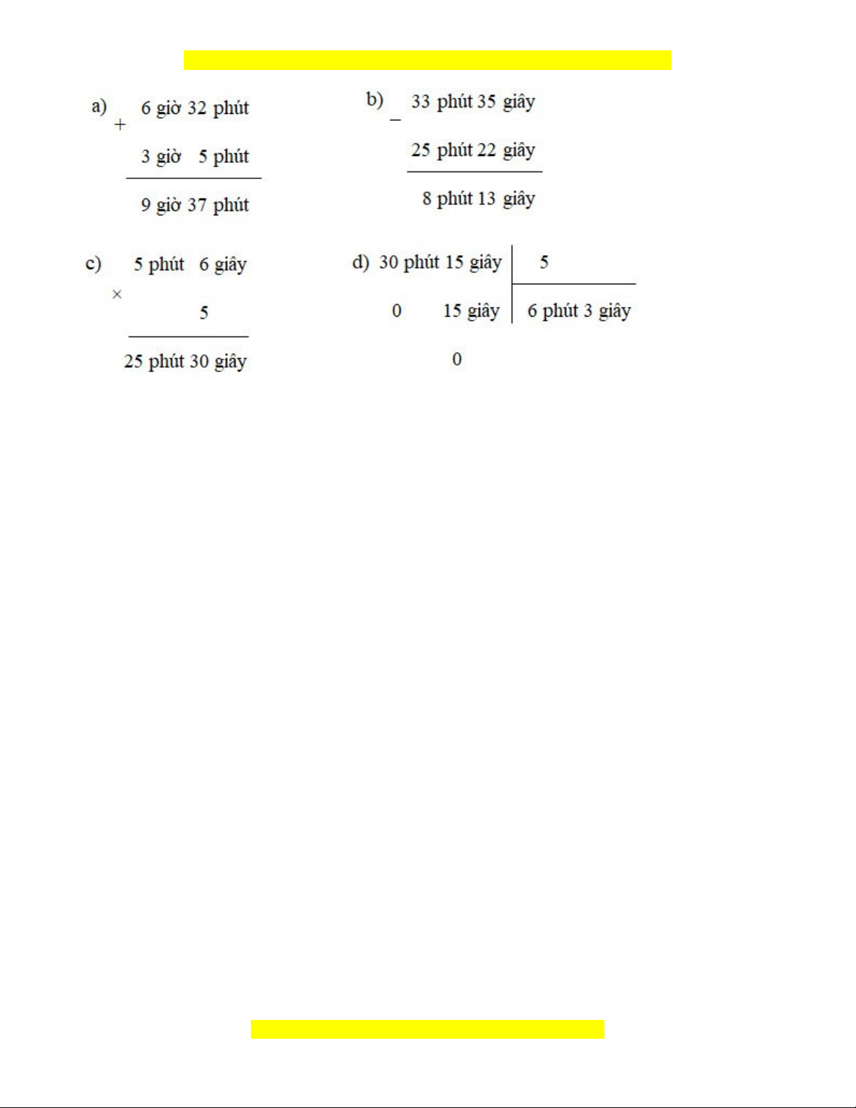 b) 33 phút 35 giây – 25 phút 22 giây c) 5 phút 6 giây × 5 d) 30 phút 15 giây : 5