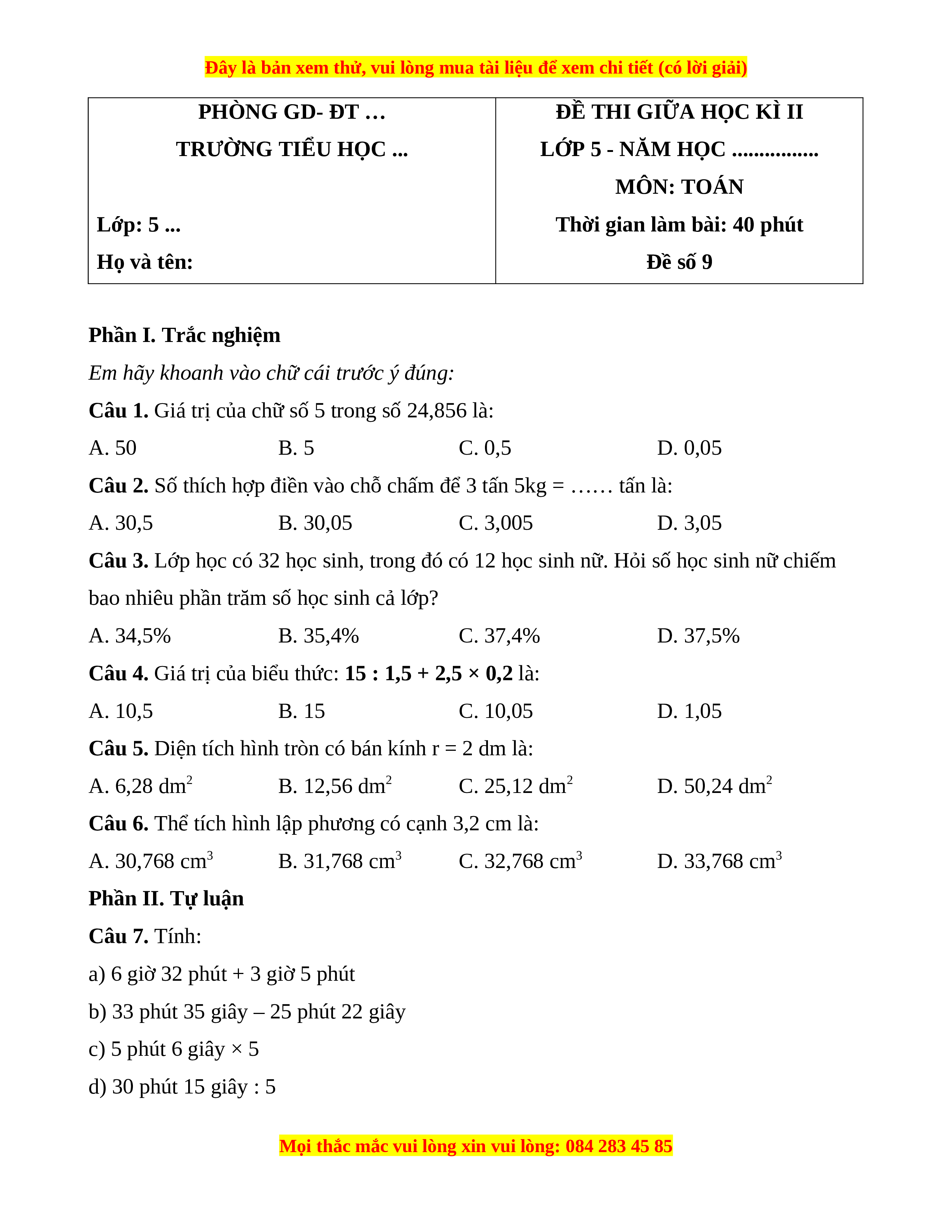 Đề thi giữa kì 2 Toán 5 năm 2023 (Đề 9)